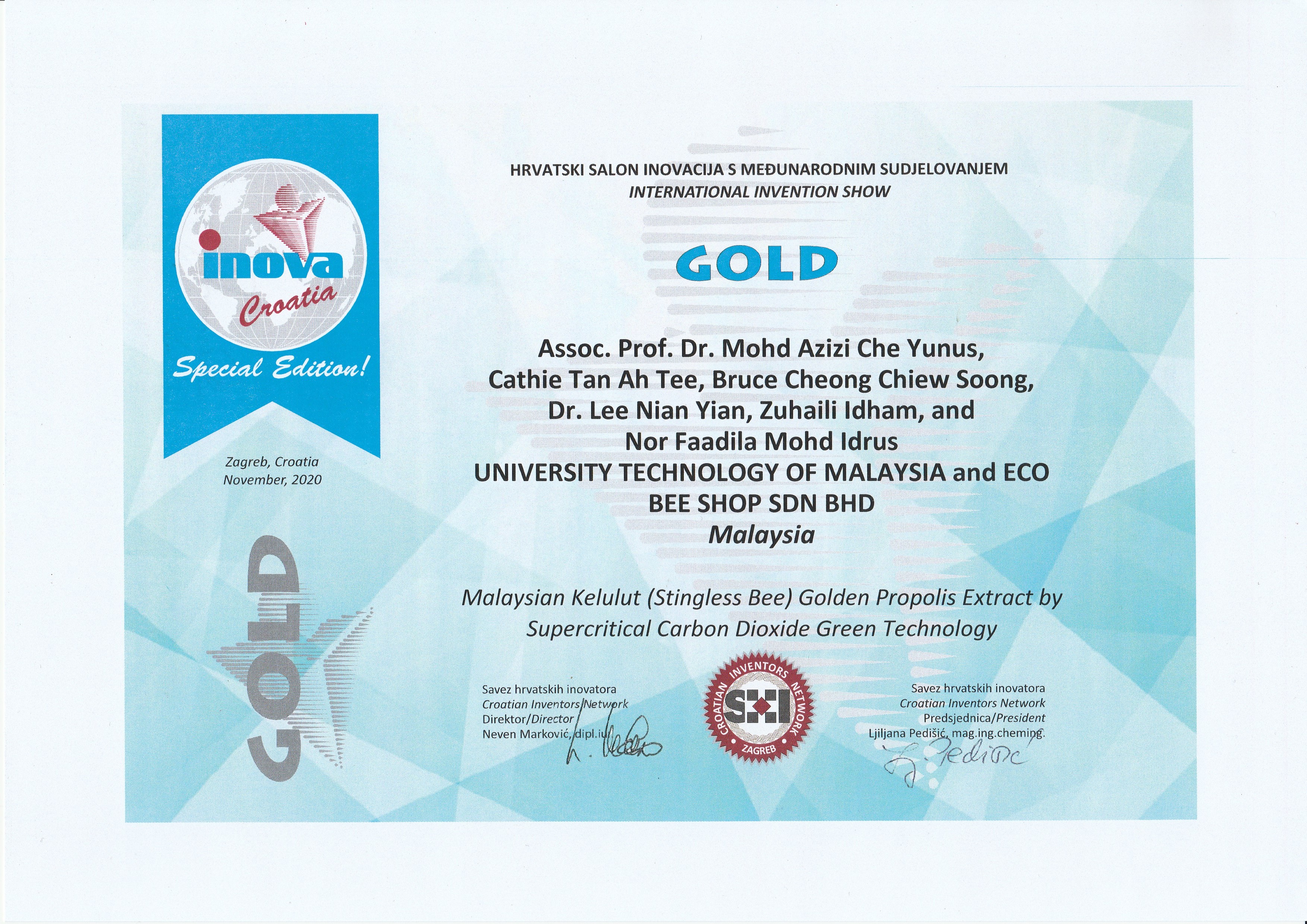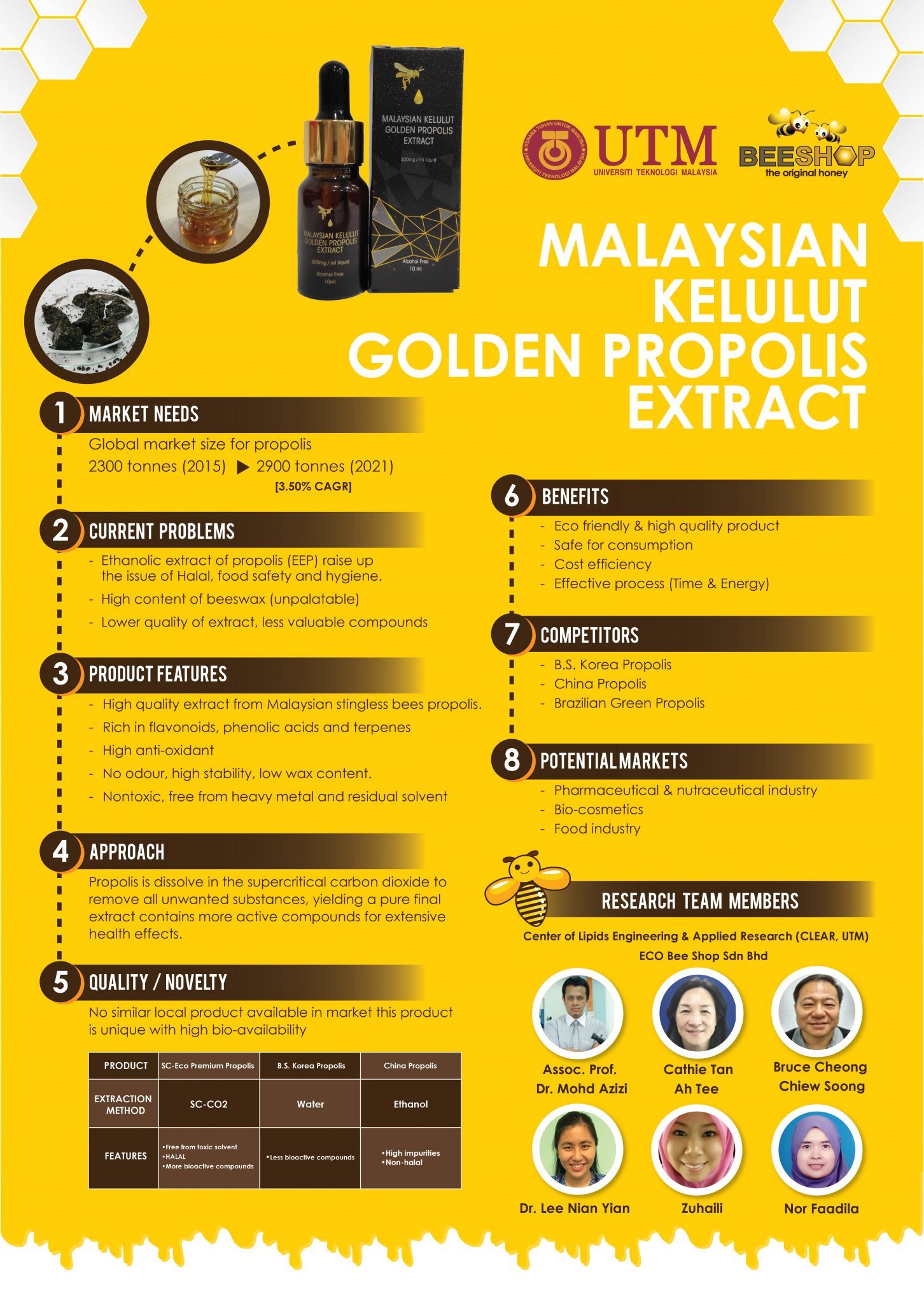Along with other bees’ product such as honey and royal jelly, Malaysian stingless bees (Kelulut) propolis has outstanding therapeutic properties. However, ethanolic extract of propolis (EEP) raise-up the issue of food safety and halal. Furthermore, high content of unpalatable beeswax causes lower quality and purity of EEP. Extraction of propolis with supercritical carbon dioxide (SC-CO2) produces alcohol-free propolis extract. The high selectivity of SC-CO2 allows the separation of valuable compound from propolis. Therefore, propolis is dissolved in the SC-CO2 to remove all unwanted substances, yielding a pure final gold propolis extract rich in active compounds for extensive health effects.